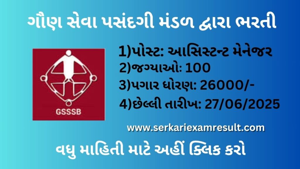 GSSSB Recruitment 2025 Apply Online for Assistant Manager Class-3 Posts: Gujarat Gaun Seva Pasandagi Mandal Published Advertisement For Assistant Manager Class-3. Eligible Candidates Are Advised To Refer The Official Advertisement And Apply For This Assistant Manager Class-3. You Will Find Below Other Details Like Age Limit, Educational Qualification, Selection Process, Application Fee And How To Apply For GSSSB Recruitment 2025 for Assistant Manager Class-3 Posts Detailed In This Article.