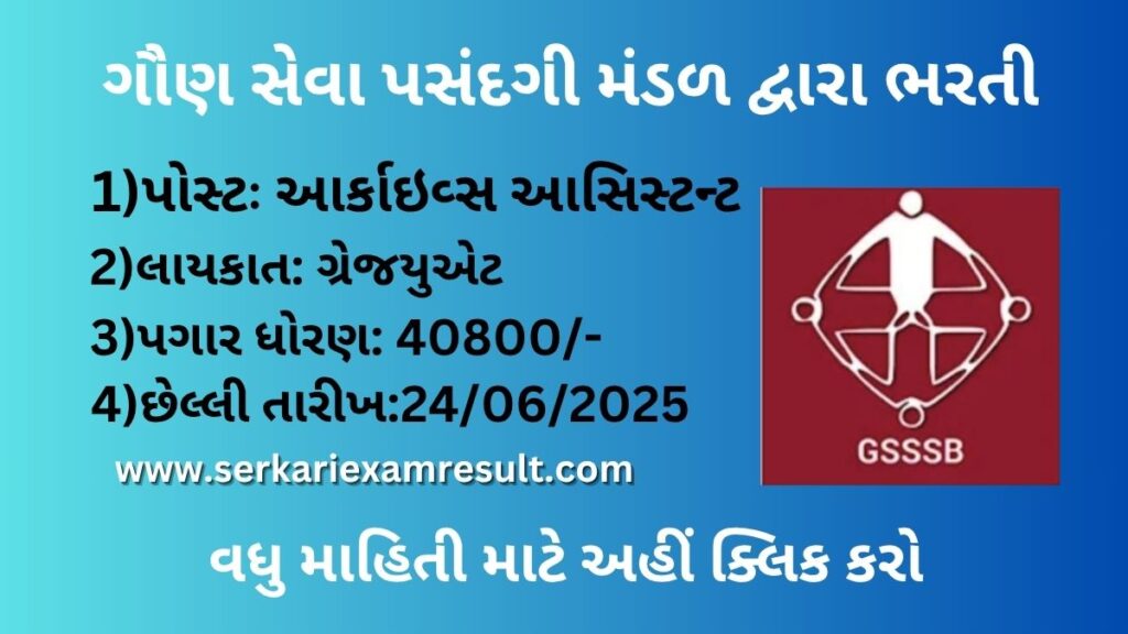 GSSSB Recruitment 2025 Apply Online for Archives Assistant Class-3 Posts: Gujarat Subordinate Services Selection Board, Gandhinagar Invites Online Applications From Candidates Through Ojas Website To Prepare A Selection List For Filling Up A Total Of 14 Posts Of “Archives Assistant”, Class-3, Under The Control Of The Department Of Sports, Youth And Cultural Activities, Under The Office Of The Head Of The Department, Registrar, Gandhinagar, Through Direct Recruitment Through Competitive Examination. For This, Candidates Will Have To Apply Online Through The Website Https://ojas.gujarat.gov.in Between 10/06/2025 (14-00 Hrs.) To 24/06/2025 (Time Till 11.59 Hrs.).